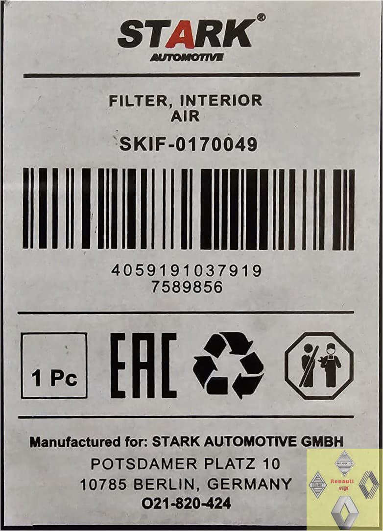 Filter is aftermarkt van het merk Stark en vergelijkingsnummer Renault 7700424098.