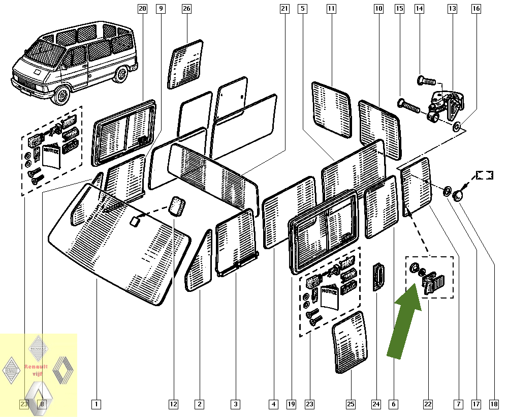 Scharnier ten behoeve achterraam Renault Trafic I.