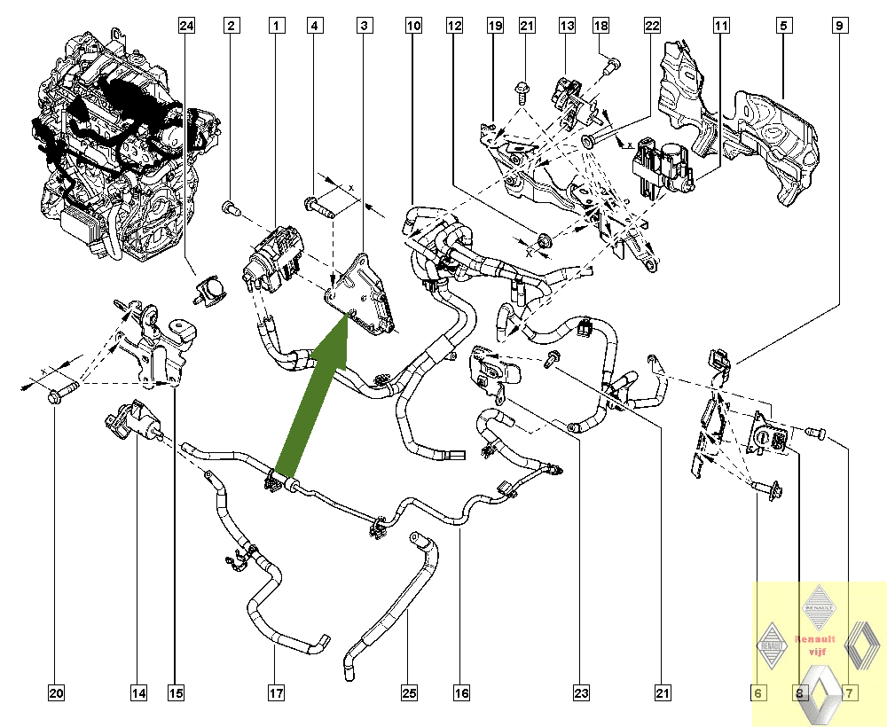 Steun zit bij de Laguna II op de G9T (2.2) diesel en bij de Trafic III op de R9M (1.6 Dci) diesel.